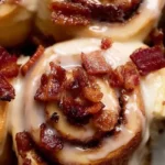 Deliciously indulgent cinnamon rolls infused with bourbon and topped with crispy bacon, perfect for a special breakfast or brunch.