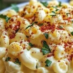 A creamy and tangy macaroni salad that combines the classic flavors of deviled eggs, perfect for any occasion.