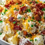 A delightful dish that merges classic potato salad with the indulgent flavors of a loaded baked potato, featuring creamy potatoes, crispy bacon, and rich cheese.
